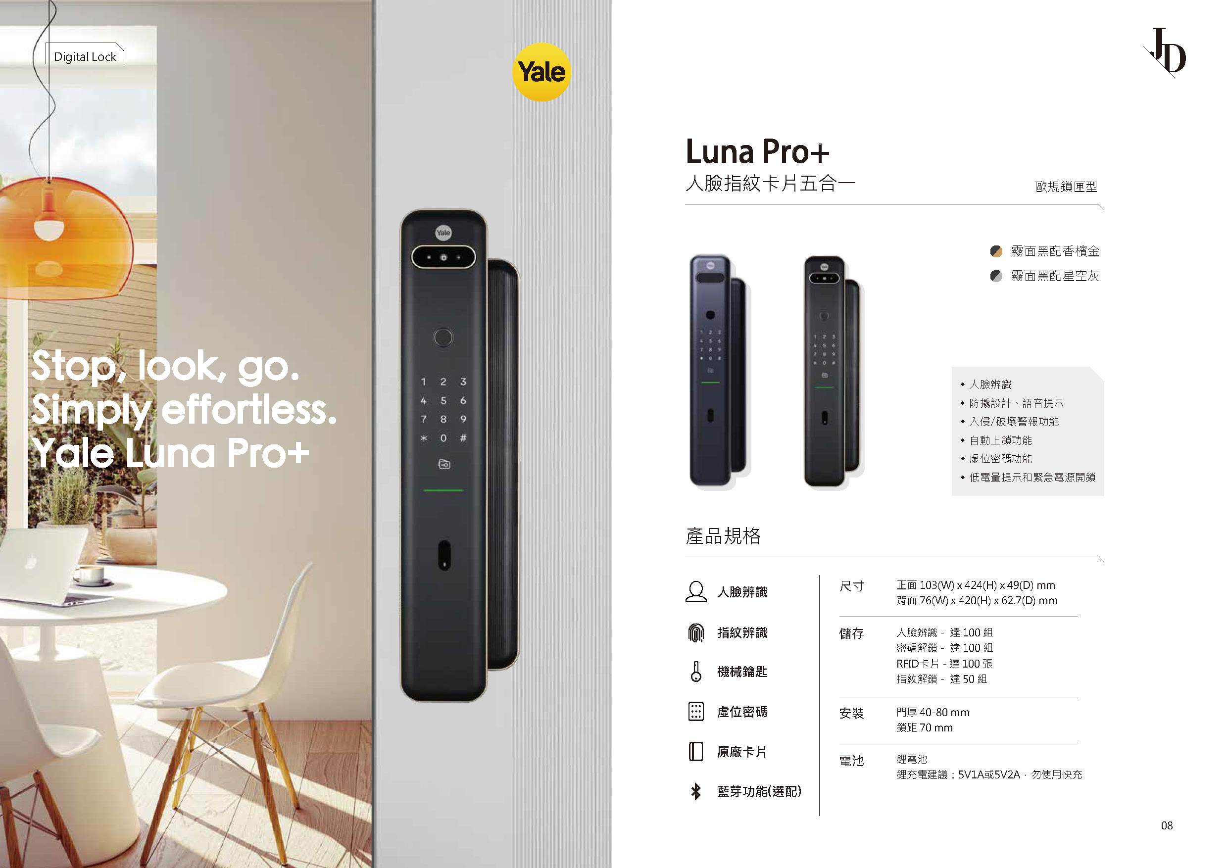 耶魯 Yale Luna Pro+ 人臉指紋卡片五合一電子鎖