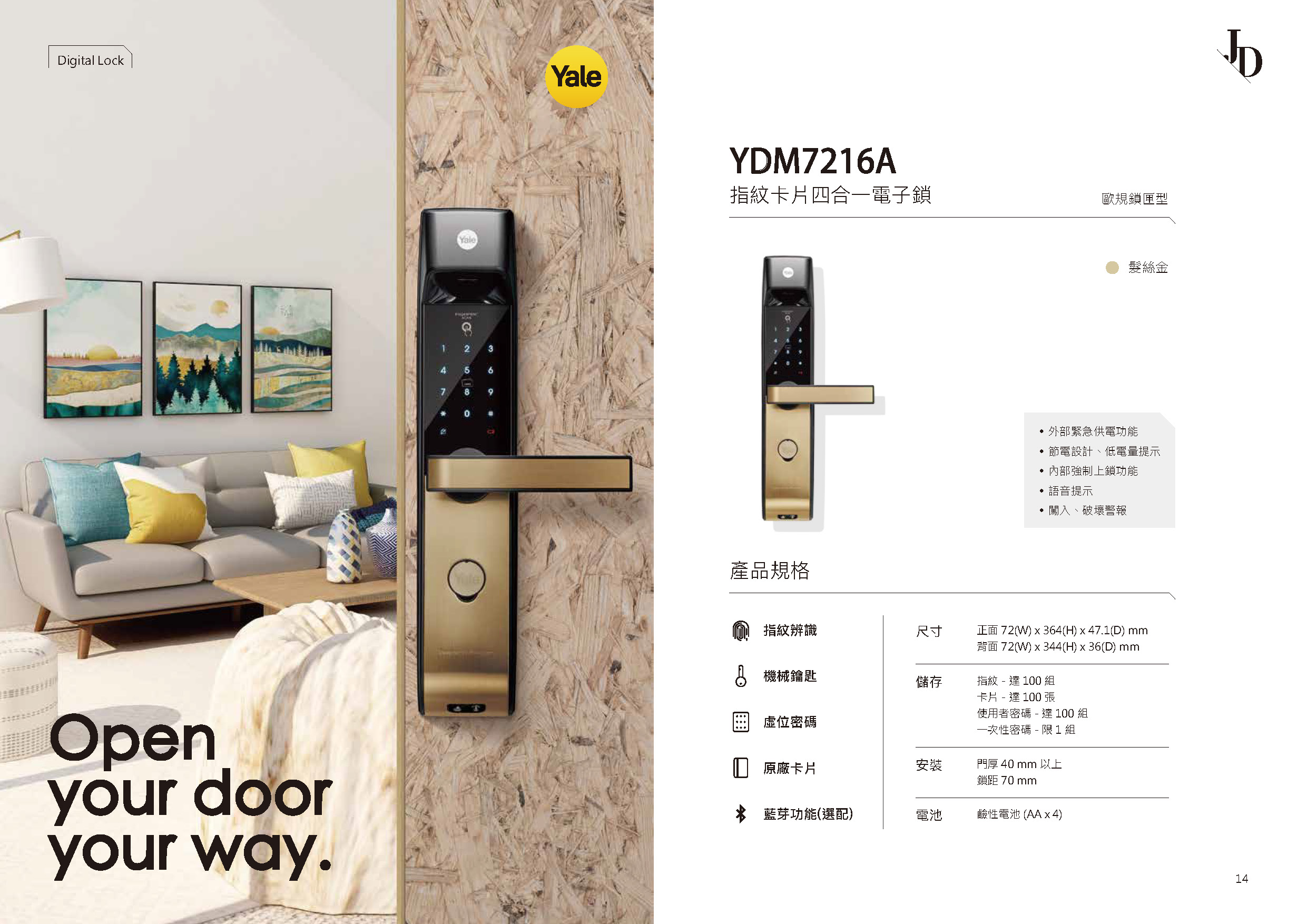 耶魯 Yale YDM7216A 指紋卡片四合一電子鎖