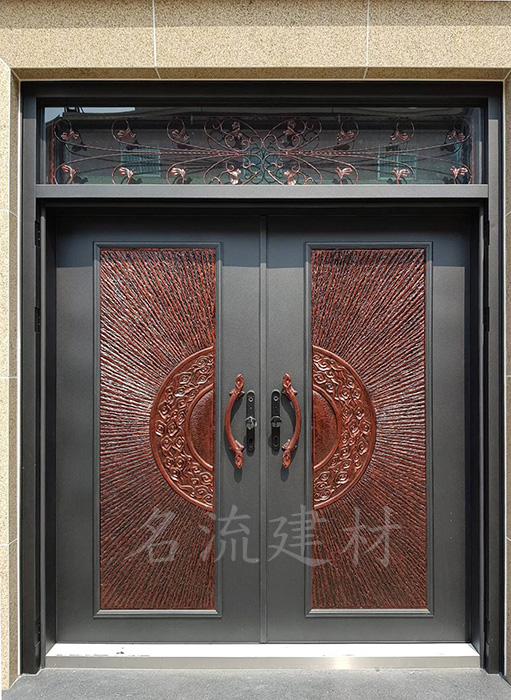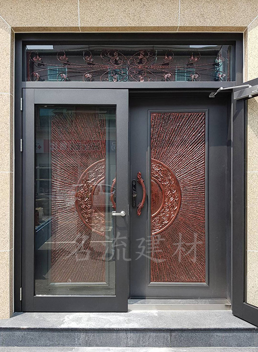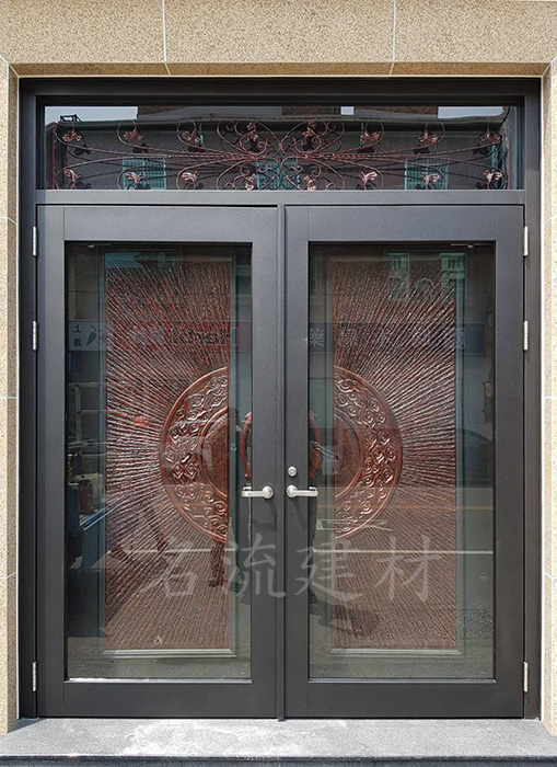 14.玄關門-光芒四射中肚銅雕門【外玄關扁管玻璃門】